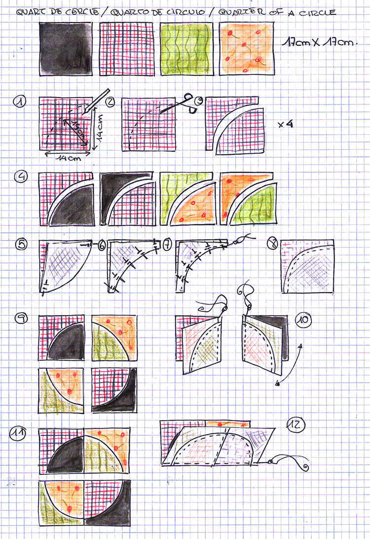 comencem a cosir: de tira en tira, unim el primer quadrat amb el segon (3) i el
